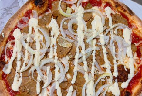 Tomates San Marzano, mozzarella fior di latte, beignets d'aubergines, saucisse italienne, ail, parmesan