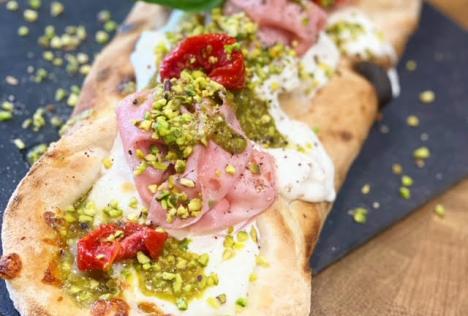 Mozzarella fior di latte, crème de truffe noire, pesto de pistaches, mortadella, burrata, pistaches concassées
