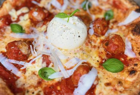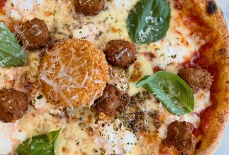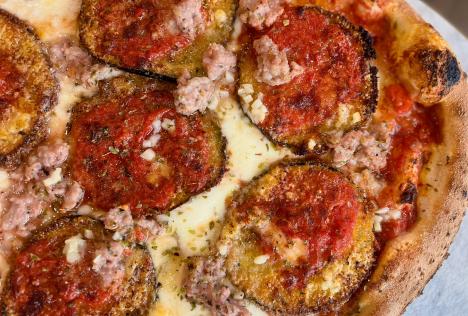 Tomates San Marzano, mozzarella fior di latte, beignets d'aubergines, saucisse italienne, ail, parmesan