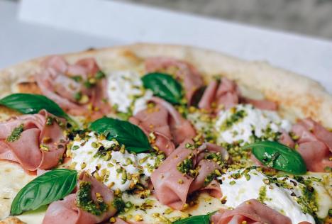 Mozzarella fior di latte, pesto, mortadella, stracciatella, pistaches, basilic frais