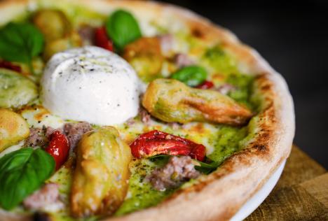 Crème de courgettes, mozzarella fior di latte, saucisse italienne, tomates semi-séchées, burrata, beignets de fleur de courgettes